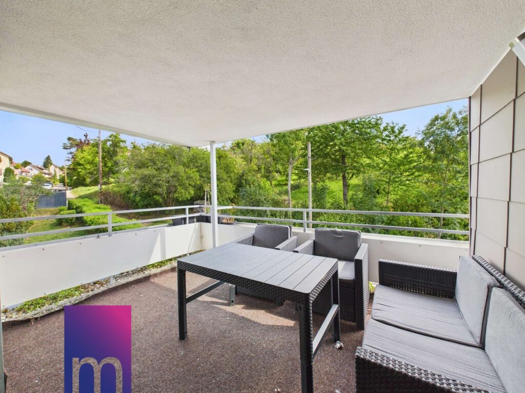 Das Herzstück der Wohnung, das Wohnzimmer, bietet genügend Raum um eine gemütliche Sofalandschaft einzurichten. Vom angrenzenden Balkon haben Sie einen Ausblick ins Grüne und über Esslingen.
