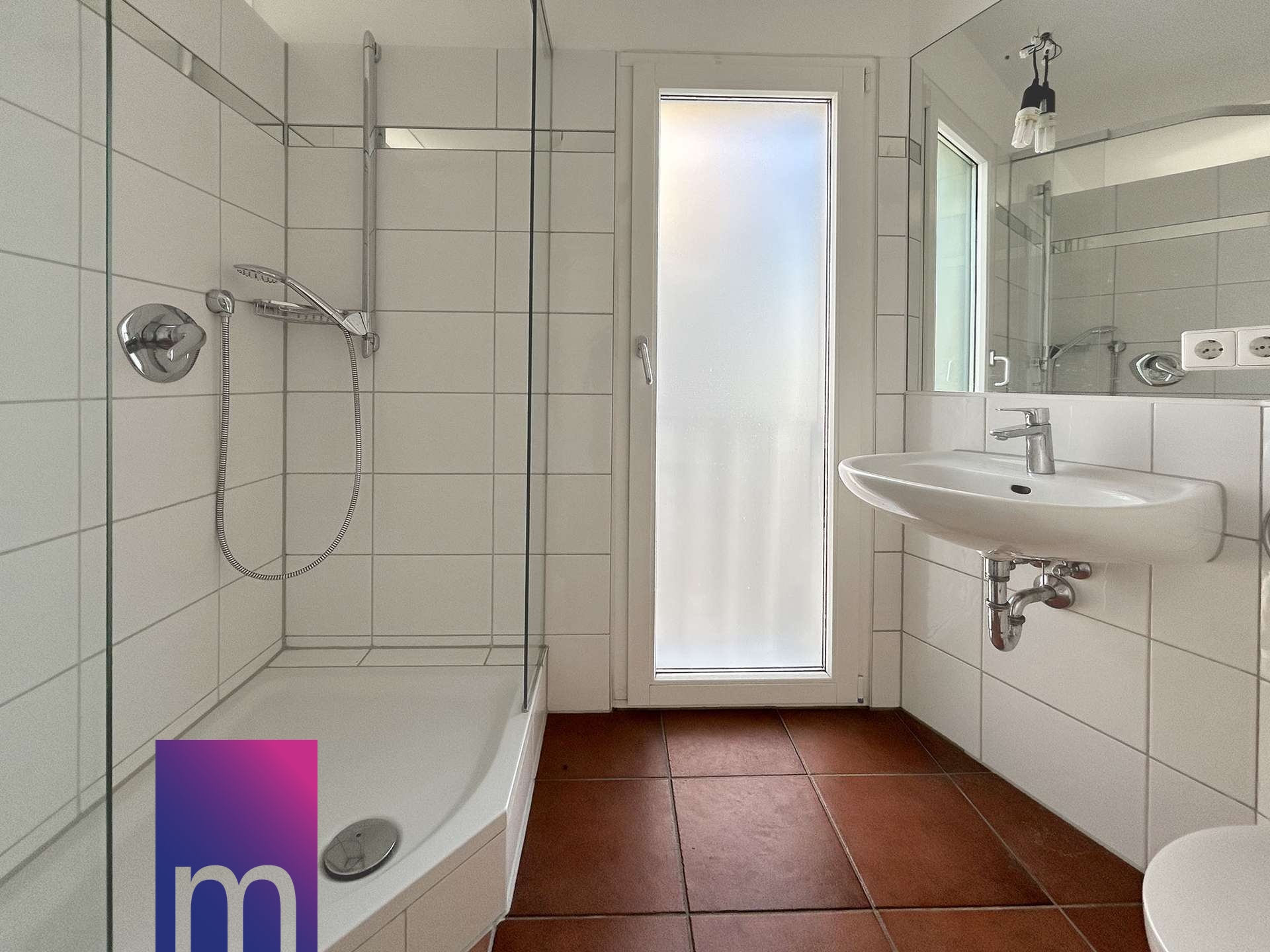 Das Tageslichtbad ist ebenfalls hell gestaltet und mit einer komfortablen, großen Dusche mit Verglasung an den Seiten ausgestattet.