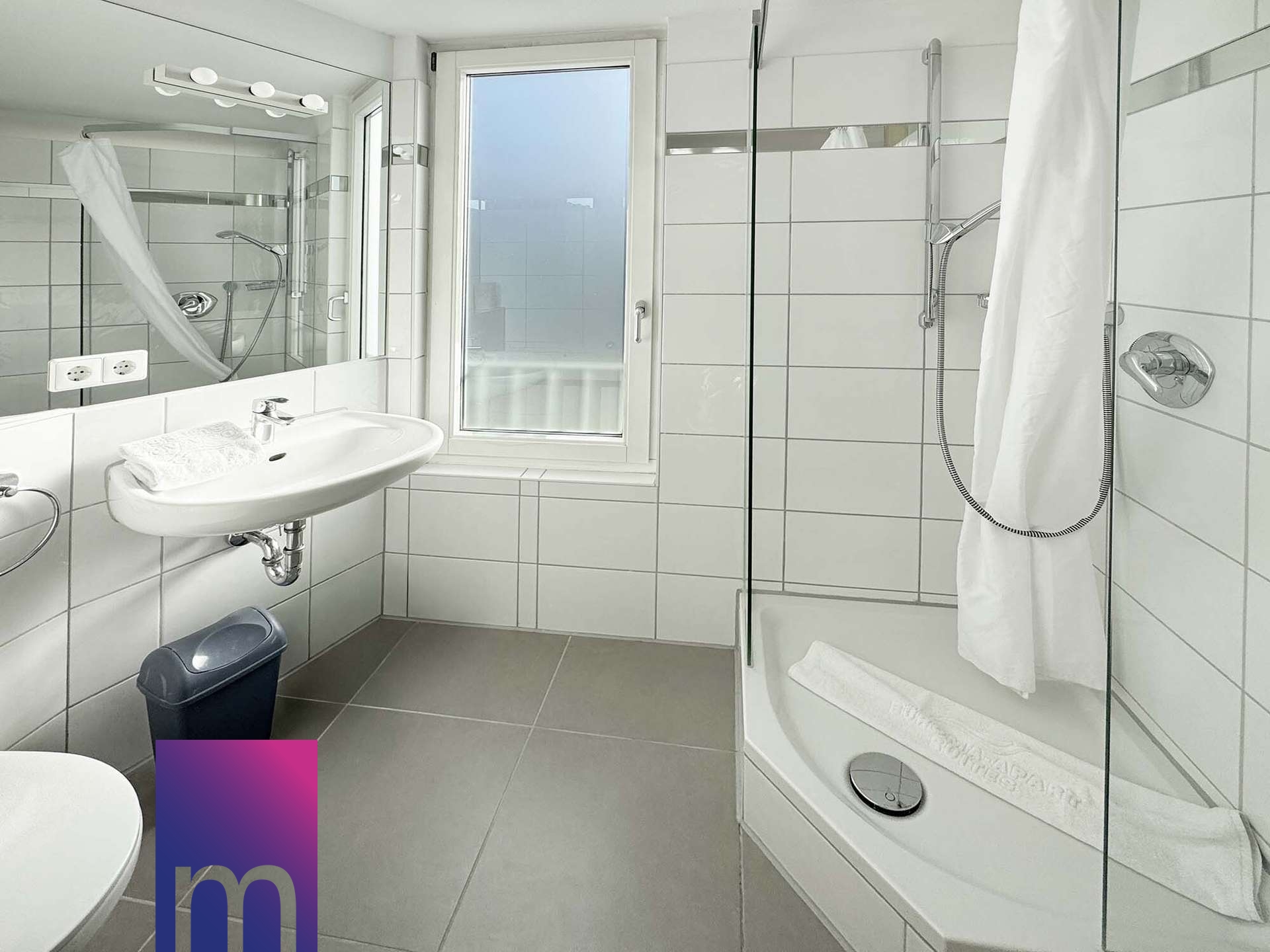 Das Tageslichtbadbad ist ebenfalls hell gestaltet und mit einer komfortablen, großen Dusche mit Verglasung an den Seiten ausgestattet.
