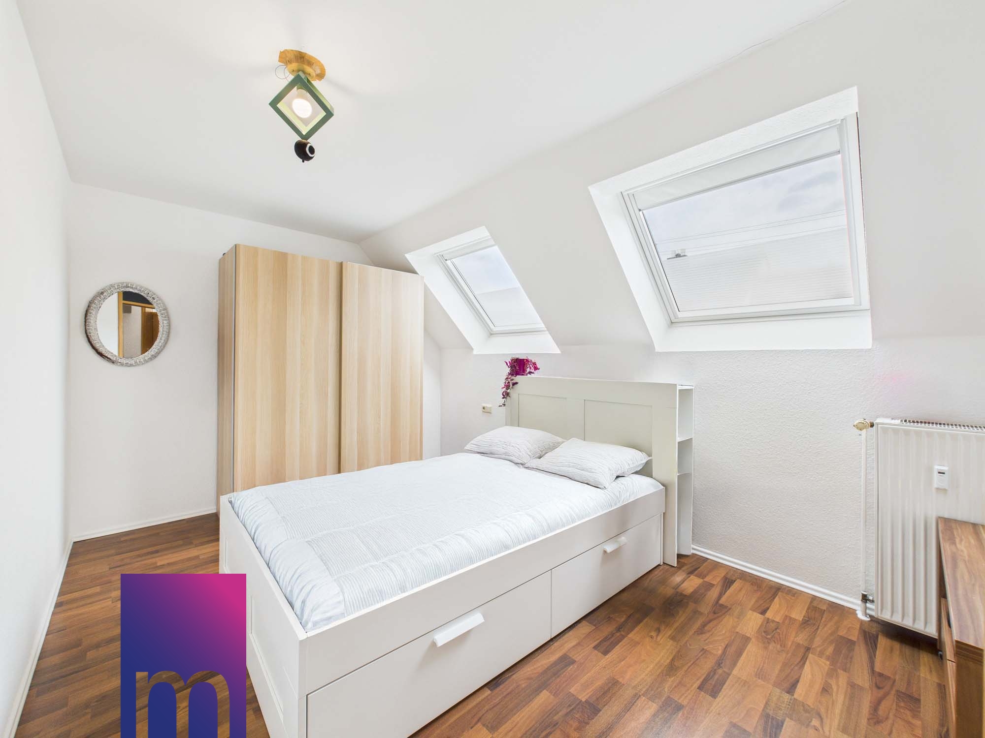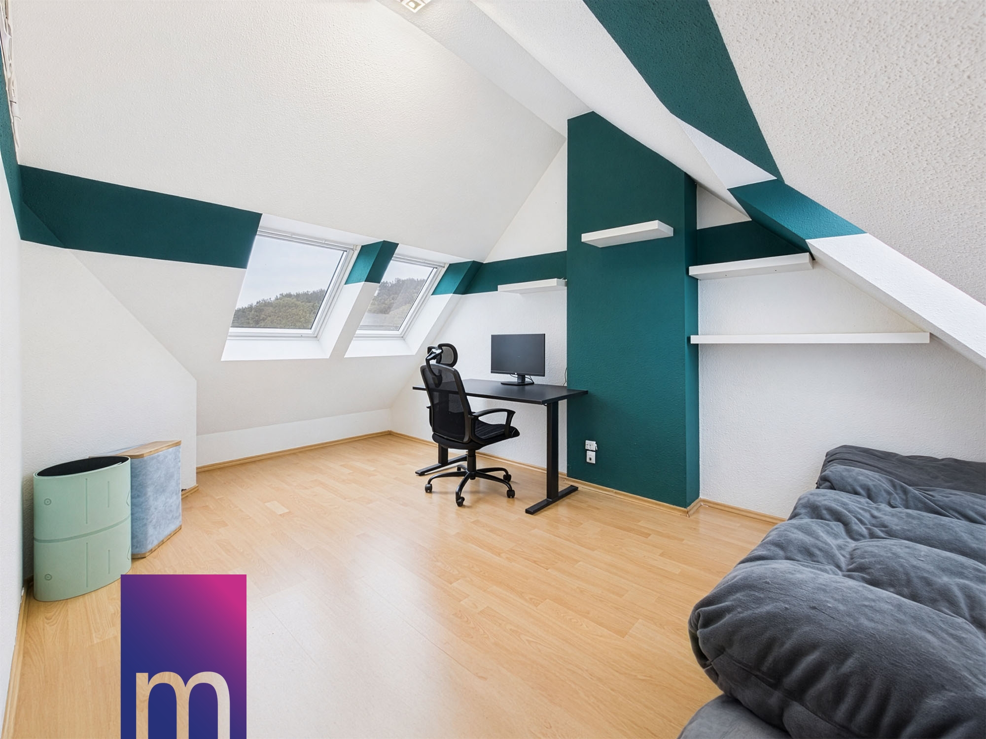 Über die Treppe gelangen Sie in die obere Ebene der Wohnung. Hier erwartet Sie ein offener Bereich mit besonderem Charme, der durch die Dachschrägen und die großzügige Raumhöhe ein sehr angenehmes Wohngefühl vermittelt. Zwei weitere Zimmer bieten flexible Nutzungsmöglichkeiten – beispielsweise als Kinderzimmer, Homeoffice oder Hobbyraum. Damit eignet sich die Wohnung ideal für Familien oder für alle, die zusätzlichen Raum zum Arbeiten oder für persönliche Interessen benötigen.