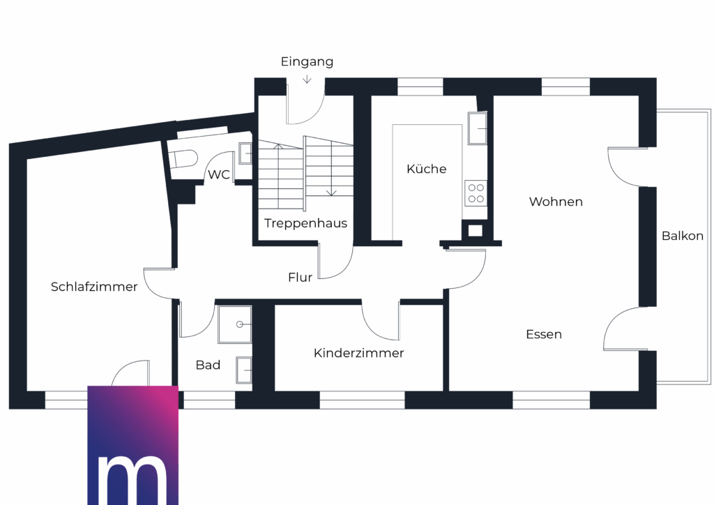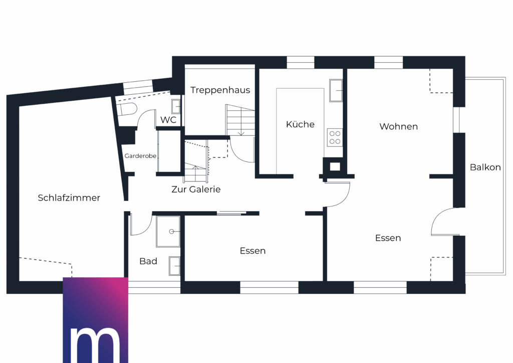 Das Erdgeschoss besticht durch seinen durchdachten Grundriss und die hochwertige Renovierung. Drei helle Zimmer bieten viel Platz zum Leben und Entspannen. Der großzügige Wohn- und Essbereich ist lichtdurchflutet und führt auf einen uneinsehbaren Balkon – perfekt zum Verweilen im Freien. Die moderne Einbauküche ist ein echter Blickfang und bietet alles, was das Herz begehrt.